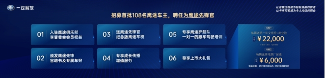 同時(shí),為了最大程度的回饋厚愛與支持,解放鷹途面向首批客戶,在線上線下全面開啟了“108名鷹途先鋒官”招募活動(dòng)。前108名鷹途車主,將成為鷹途先鋒官,不僅可以直接入駐鷹途俱樂部,享受黃金會(huì)員權(quán)益,還將授予其鷹途先鋒官聘書及專屬車貼;每位先鋒官均可獲贈(zèng)紀(jì)念版鷹途車模一個(gè),并專享成長傳播增值服務(wù)、鷹途護(hù)航隊(duì)一對(duì)一的跟車駕駛培訓(xùn)。在2022年7月26日- 8月31日上市期間購買鷹途的車主,還將尊享鷹途上市限量大禮包,即每輛鷹途可獲得第一年價(jià)值22000元的交強(qiáng)險(xiǎn)、商業(yè)險(xiǎn),并享有續(xù)保優(yōu)惠,以及價(jià)值6000元的兩噸原廠尿素等兩大超值福利。