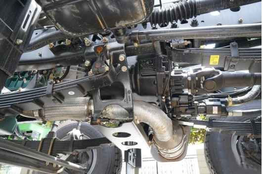 該車后處理使用結構更為緊湊的U型后處理,好處就是不會占用太多的底盤空間。而該后處理的技術路線為高效SCR的國六排放技術路線,其可以降低再生頻次。還有考慮到工程車發動機的負荷變化率大,為了保證排溫,搭載有電控排氣蝶閥,有了它就可以讓后處理高效工作,并減少結晶的概率。