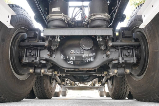 說完動力鏈匹配,我們再來聊聊這款解放J6L 8×4自卸車的轉向和通過性。實拍車型的轉向機為新開發的大缸徑變速比產品,轉向的手感非常輕,而且響應很快。還有該車的轉向橋到驅動橋之間的軸距僅為2250mm,前橋的轉向角由之前的45度增加到47度,將其轉彎半徑縮小1.2米,在通過一些狹窄場地時更輕松。