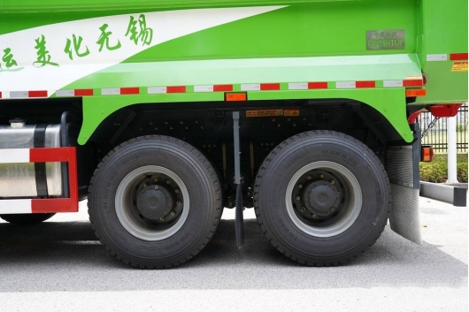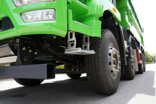 最后就是車橋,對于自卸車來說,車橋的可靠性、通過性及輕量化是很重要,那么普通的單級減速車橋很難滿足以上需求。所以該車配備的是速比為5.263的233輪邊減速車橋,其重量上要比常見的車橋少260公斤左右,那是怎么做到的呢?這是因為該車橋的輪邊采用減重輕量化設計,其橋殼為高強度的鑄造橋殼,還有主減速器是結合歐洲技術全新開發的高扭矩性能產品,不僅輕,還能承受更大的扭矩。