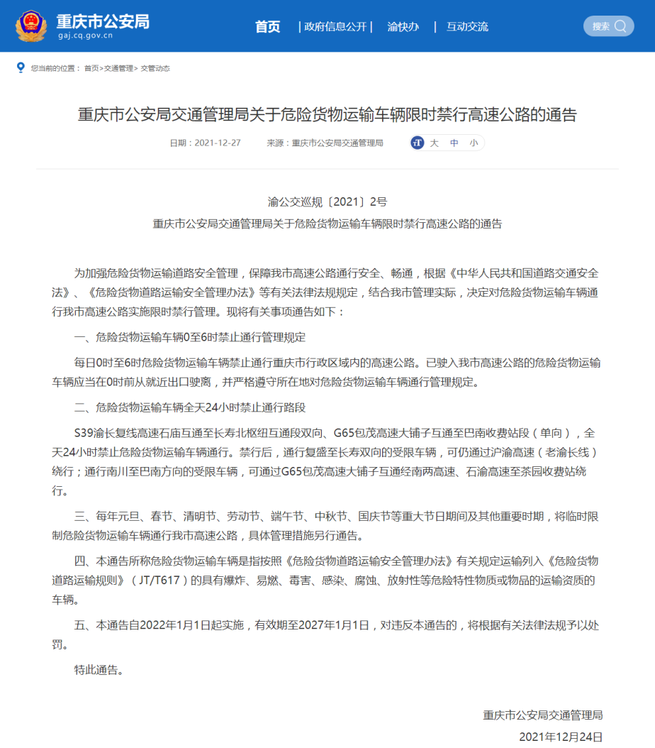 每年元旦、春節、清明節、勞動節、端午節、中秋節、國慶節等重大節日期間及其他重要時期,將臨時限制危險貨物運輸車輛通行重慶市高速公路。