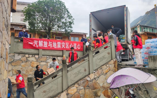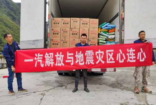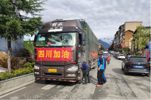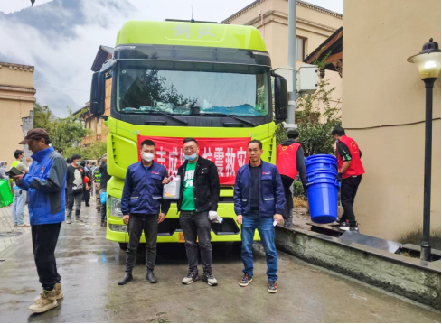 在地震發(fā)生后,位于甘孜的解放康巴金馬服務(wù)站沒有退縮,毅然選擇了“逆行”災(zāi)區(qū)。第一時間組織籌備救災(zāi)物資和提供救援服務(wù),僅用一天的時間就籌備了110袋大米、110桶食用油、200多件飲用水等災(zāi)區(qū)緊缺物資,挺進(jìn)震中位置磨西鎮(zhèn)。