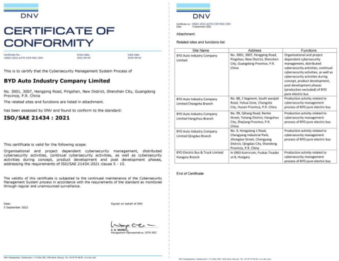 DNV集團作為全球最具公信力及最早進入中國地區的國際認證機構之一,認證業務始終秉持技術領先的優勢,獲得超80個國家授信認可,累發各類管理體系證書超6.5萬張。本次DNV對比亞迪頒出其在商用車領域的全球首張ISO/SAE 21434證書,既是對比亞迪商用車網絡安全體系管理的充分肯定,也是對比亞迪技術領先、品質領先的又一次權威背書。