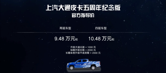 恰逢上汽大通MAXUS皮卡五周年之際,隨著五周年紀(jì)念版皮卡車型的加入,上汽大通MAXUS也將以更完整的皮卡家族體系,多方面滿足皮卡用戶需求,為皮卡車市注入強動能,引領(lǐng)未來皮卡出行新潮流。作為上汽大通MAXUS五星時尚皮卡,五周年紀(jì)念版皮卡車型不僅是一輛工具車,它更是一輛有里有面的全能型皮卡。新車共推出兩種驅(qū)動款式車型,兩驅(qū)車型起售價9.48萬元,四驅(qū)車型起售價10.48萬元。