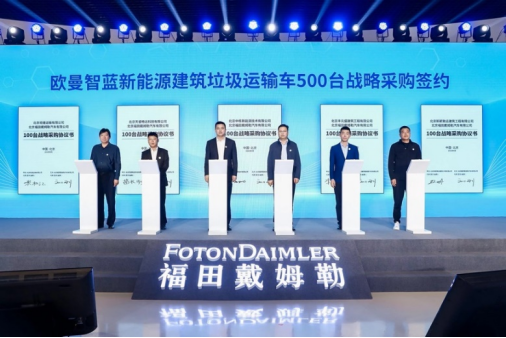 【歐曼智藍新能源建筑垃圾運輸車500臺戰略采購簽約】