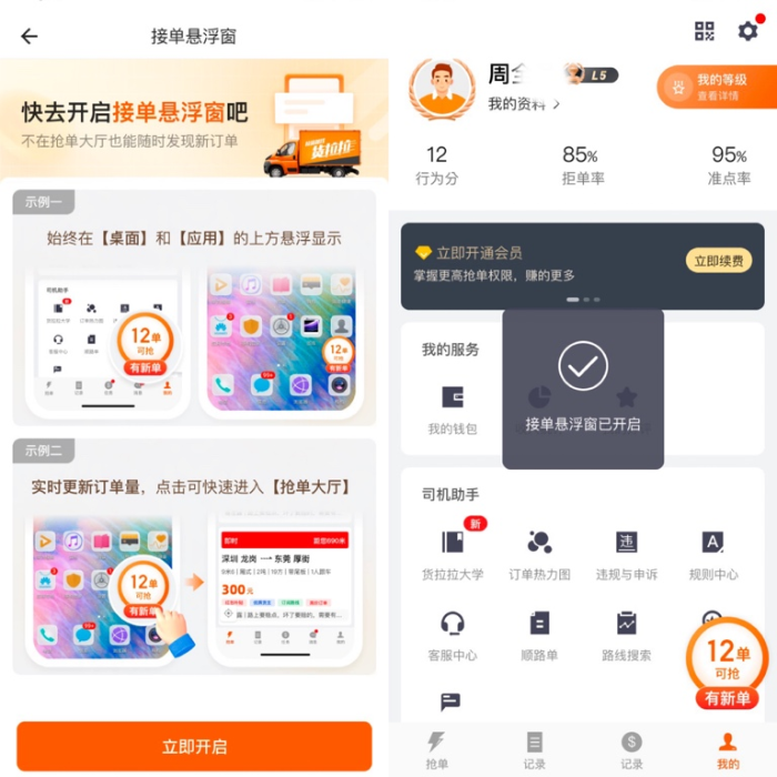 針對司機反饋“退出搶單大廳后訂單接收不及時、容易錯過很多好訂單”等問題,今年8月起,貨拉拉上線懸浮窗功能。“懸浮窗開啟后,即便不在搶單大廳,也能收到來單信息,點開懸浮窗就可搶單接單。”廖師傅稱,“再也不用一直盯著搶單大廳刷新了。”