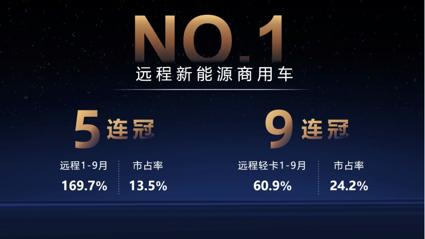作為商用車領域的新勢力品牌,遠程以新能源化、智能化技術為引領,擁有覆蓋商用車全場景的新能源產品;以創新商業模式為基礎,布局綠色補能網和運力平臺。依托技術優勢和生態布局優勢,遠程在這一輪行業機遇期快速發展,確定了行業頭部地位。今年1-9月,遠程新能源商用車同比增長169.7%,總體銷量行業第一,其中遠程新能源輕卡1-9月市占率達24.2%,總體銷量排名行業第一,且實現連續9個月行業第一。