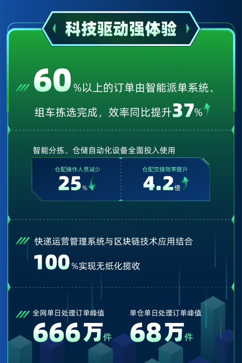 據(jù)相關(guān)數(shù)據(jù)顯示,目前百世60%以上的訂單都是由智能派單系統(tǒng)、組車揀選完成。由于智能分揀、倉儲自動化設(shè)備全面投入使用, 相比去年同期,百世倉配操作人員減少25%,倉配交接效率提升4.2倍。但在大促期間,全網(wǎng)單日處理訂單峰值卻高達(dá)666萬單,單倉單日處理訂單峰值為68萬單。更令人欣喜的是,快遞運(yùn)營管理系統(tǒng)與區(qū)塊鏈技術(shù)應(yīng)用結(jié)合實(shí)現(xiàn)了100%實(shí)現(xiàn)無紙化攬收,向云倉的綠色低碳運(yùn)營又邁進(jìn)了一步。