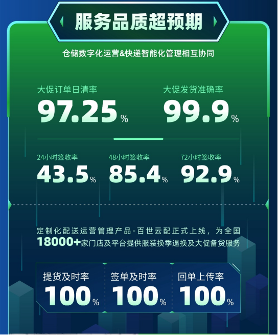 值得一提的是,定制化配送運(yùn)營管理產(chǎn)品——百世云配的正式上線功不可沒,它為全國超過18,000家門店及平臺提供服裝大促備貨和換季退換貨服務(wù), 對于線上線下一體化的品牌方而言,實(shí)現(xiàn)了云倉與門店、門店與門店間的及時(shí)調(diào)配,令提貨及時(shí)率達(dá)到100%,以保證“次日達(dá)“。