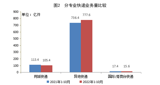 1-10月,同城快遞業(yè)務(wù)量累計完成105.4億件,同比下降7.0%;異地業(yè)務(wù)量累計完成777.6億件,同比增長5.6%;國際/港澳臺業(yè)務(wù)量累計完成15.6億件,同比下降10.1%。