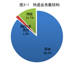 1-10月,同城、異地、國際/港澳臺快遞業(yè)務(wù)量分別占全部快遞業(yè)務(wù)量的11.7%、86.5%和1.8%;業(yè)務(wù)收入分別占全部快遞業(yè)務(wù)收入的6.5%、49.3%和10.8%。與去年同期相比,同城快遞業(yè)務(wù)量的比重下降1.4個百分點,異地快遞業(yè)務(wù)量的比重上升1.6個百分點,國際/港澳臺業(yè)務(wù)量的比重下降0.2個百分點。