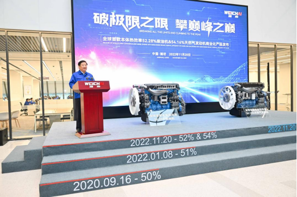 濰柴動力于2020年9月、2022年1月、2022年11月分別發(fā)布本體熱效率為50.23%、51.09%、52.28%的柴油機(jī),每次均突破全球商業(yè)化柴油機(jī)的本體熱效率之最,三年“三級跳”,連續(xù)三次實(shí)現(xiàn)了高效動力天花板的突破。
