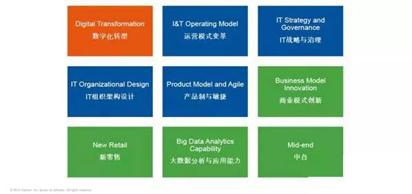 無論學界抑或業界,當前數字化轉型的重點可以歸結為“一個‘轉型’下的兩個‘模式’變革”。具體而言,第一個模式是指“IT運營模式”——IT運營模式變革會涉及IT戰略與治理、IT組織架構設計、產品制與敏捷。另一個模式是指“商業模式”。在商業模式創新的大背景下,新零售、大數據分析與用能力以及中臺是目前的熱門話題和概念。