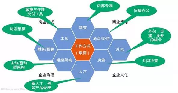 總結而言,企業在改變自身工作模式的同時,其他相關方面也需進行調整。例如,企業在未來引入敏捷模式后,其外包策略會發生巨大變化;加之出于自身探索和外部不確定性等原因,外包、自建、投資、組合將成為企業未來發展的熱點議題。