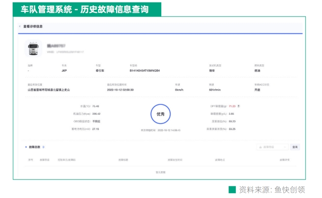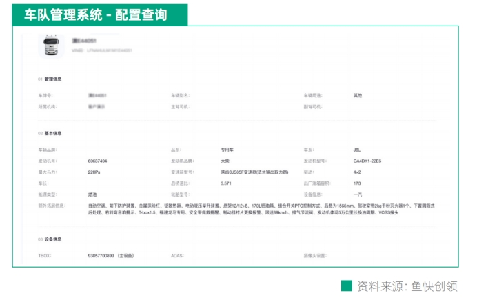 如何實現車隊“精細化管理”?以魚快創領為車隊提供的管理系統為例:車隊管理者在首頁輸入車牌號或者車架號后,即可在該頁面看到對應車輛的基本配置,包括:駕駛室、發動機、變速箱、后橋、懸架、鞍座、后處理系統等。以上信息可幫助車隊管理者快速查并了解一臺車的相關配置。
