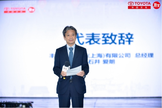 作為主辦方代表,豐田產業車輛總經理石井愛朗先生率先致辭。石井總經理表示在進入中國20周年即將到來之際,我們將繼續以安全性、高品質和耐久性為關注核心,始終站在客戶立場,鋪開中國事業,致力于成為客戶值得信賴的綜合解決方案供應商。