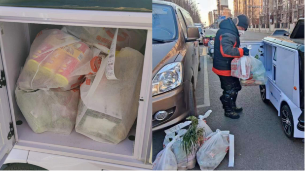 據了解,小魔駝配送的物資以居民日常生活所需的蔬菜、肉類、雞蛋、水、方便面等為主。訂單在出倉庫放入小魔駝前,少會經過2次逐件消殺,在派送前和配送結束后,工作人員也會對小魔駝進行消殺,確保無接觸配送的安全性。