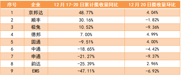 根據郵政業安全中心監測數據,12 月 20 日,全國主要品牌快遞企業攬收量約為 2.61 億件,環比下降2.2%;全網投遞量約為 2.86 億件,環比上升0.4%。12月17日—20日,全國主要品牌快遞企業攬收量為10.74億件,同比下降19.37%。