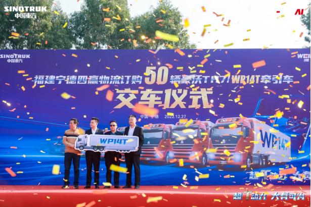 2022年12月27日,50輛豪沃TH7/WP14T/610馬力牽引車交車儀式在福建寧德隆重舉行。各方代表與媒體記者出席儀式,共同見證交車榮耀時刻。開啟新篇章,駛向新征程!