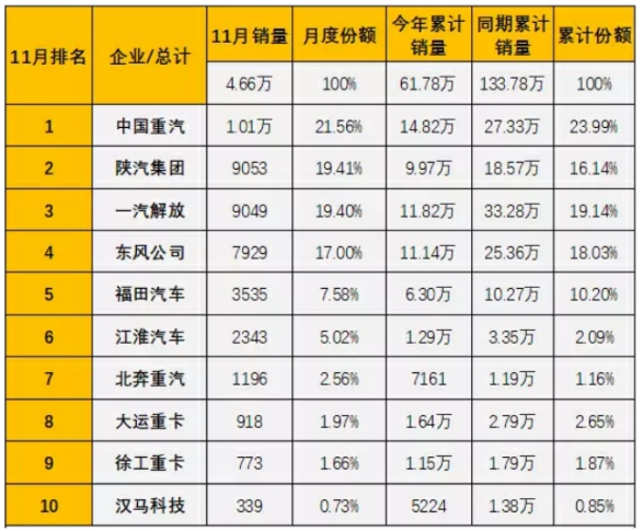 市占率方面,中國重汽重卡市場市占率從2019年的16.3%,一路攀升,增長高達7個百分點,今年上半年重卡市占率擴大至23.3%;截止今年11月份,中國重汽累計市場份額進一步提升至23.99%,位列行業第一,并且是目前第一梯隊中唯一市占率突破20%的企業,扛穩了國內重卡銷量和市占率“雙第一”的大旗。