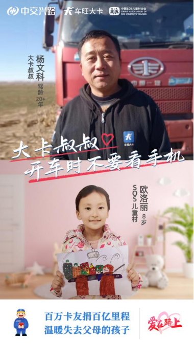 “輕輕地捧著你的臉,為你把眼淚擦干,這顆心永遠屬于你,告訴我不再孤單。”多位卡車司機和孩子們隔空對唱,并捐出自己的里程,來表達最孩子們的關愛和祝福。當SOS兒童村的孩子們得知,他們將收到大卡叔叔送來的年貨時,也通過一句句稚嫩童聲的安全提醒、用心手繪的一幅幅畫作,表達出他們對大卡叔叔的感激。