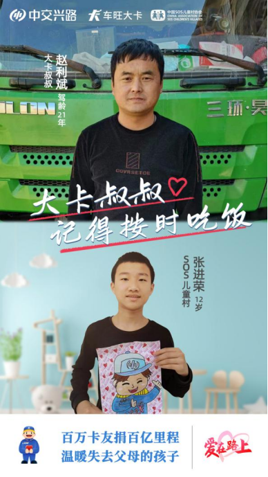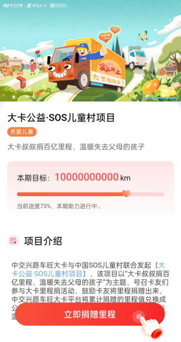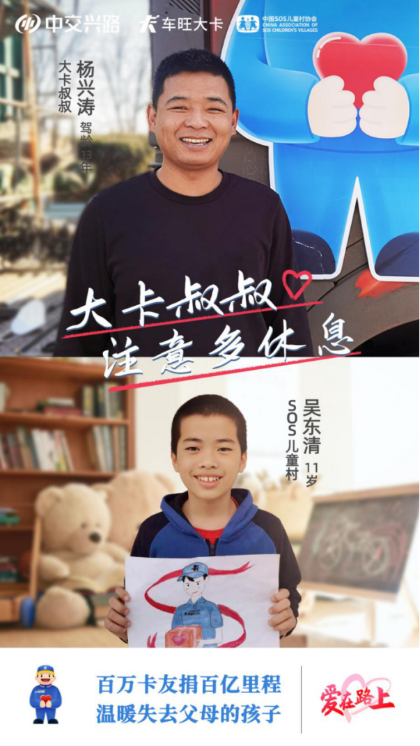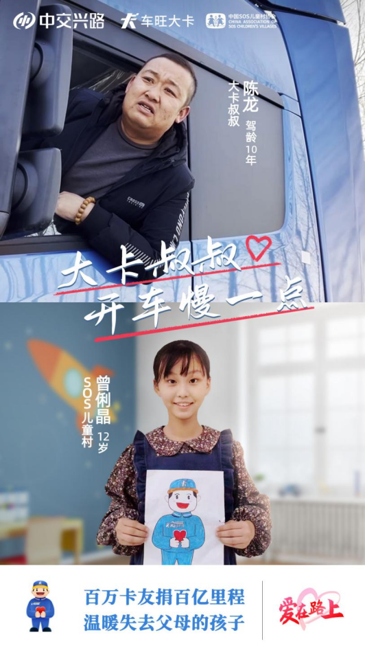 中交興路車旺大卡作為服務于中小微運輸企業、車隊和廣大司機群體的綜合性服務平臺,持續關注貨車司機群體的急愁難盼問題,讓貨運的每一公里都有中交興路關愛的身影和陪伴。此次,發起“大卡里程捐·溫暖失去父母的孩子”,通過里程捐的方式,既是幫助卡友圈的孤兒離自己的夢想更近,更是為SOS兒童村的孤兒送去溫暖,送去生活必需品。