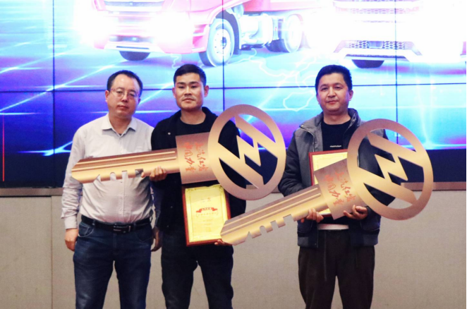 活動現場,上汽紅巖營銷公司牽引車事業部總經理鄭宇龍將象征財富的“金鑰匙”遞交到安徽福車總經理手中,本次批量交車為雙方的合作開啟了新篇章。安徽福車總經理也作為上汽紅巖“公路英雄先鋒官”代表上臺接受了授牌,他在致辭中表達了對上汽紅巖品牌的信賴:“我們用過不少品牌的重卡,但能和司機師傅們一起吃、一起送貨、一起共創產品的品牌不多,運輸行業需要像紅巖這樣的重視用戶聲音、重視用戶體驗、重視研發創新的企業,我相信買紅巖就是能賺錢、更放心,也期待以后與紅巖有更多的合作!”