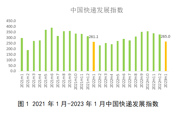 1月,快遞發展規模指數為290.2,同比提升19.4%。1月上旬,在節日消費的利好推動下,行業持續穩定運行,快遞業務量(2022年12月31日至2023年1月2日)與去年元旦假期相比增長15.2%,4日、5日連續突破4億件,市場迎來恢復性增長。春節前后是快遞業務的淡季,自1月14日(臘月二十三)起,市場規模較日常水平有所回落。春節假期(1月21日至27日),快遞包裹攬收量約4.1億件,與去年春節假期相比增長5.1%,約為2019年同期的2倍。