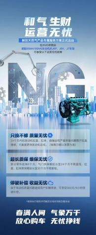 不僅如此,今年初春,解放天然氣產品用戶也迎來了專屬服務方案:“只換不修 質量無憂”“超長質保 維保無憂”和“停駛補償 收益無憂”三大保障,令2023年購買和裝配6SM4/6SM6發動機的J6P、J6V、J7車型用戶實現放心購車,無憂掙錢。這是一汽解放“以最適合用戶的車輛解決方案,打造最牛的差異化競爭力”的又一體現。