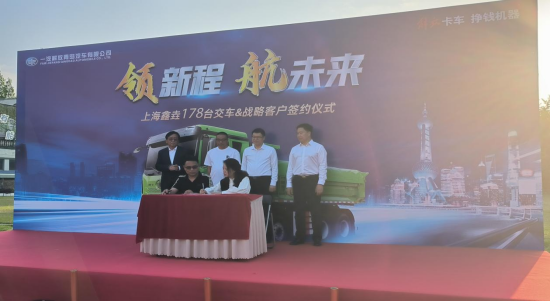 2023年4月20日,一汽解放青汽聯合經銷商上海鑫垚汽車銷售服務有限公司,在上海隆重舉行178臺交車儀式&戰略大客戶簽約儀式。解放青汽自卸車在完成上海市場全新突破的同時,為上海客戶帶來了產品更高端、服務更高效、質量更可靠的綠色智慧渣土自卸,為用戶創富添力,更為上海城市綠色建設貢獻力量。