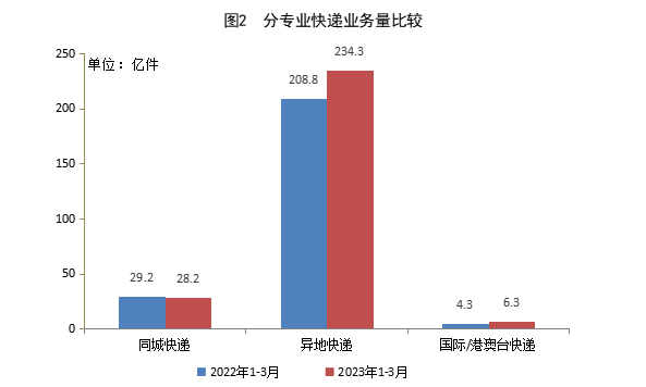一季度,同城快遞業務量累計完成28.2億件,同比下降3.2%;異地快遞業務量累計完成234.3億件,同比增長12.2%;國際/港澳臺快遞業務量累計完成6.3億件,同比增長46.8%。