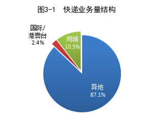 一季度,同城、異地、國際/港澳臺快遞業務量分別占全部快遞業務量的10.5%、87.1%和2.4%;業務收入分別占全部快遞業務收入的6.0%、50.8%和10.9%。與去年同期相比,同城快遞業務量的比重下降1.5個百分點,異地快遞業務量的比重上升0.9個百分點,國際/港澳臺業務量的比重上升0.6個百分點。