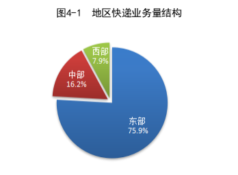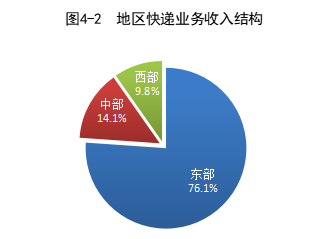 一季度,東、中、西部地區快遞業務量比重分別為75.9%、16.2%和7.9%,業務收入比重分別為76.1%、14.1%和9.8%。與去年同期相比,東部地區快遞業務量比重下降1.6個百分點,快遞業務收入比重下降1.2個百分點;中部地區快遞業務量比重上升1.0個百分點,快遞業務收入比重上升0.7個百分點;西部地區快遞業務量比重上升0.6個百分點,快遞業務收入比重上升0.5個百分點。