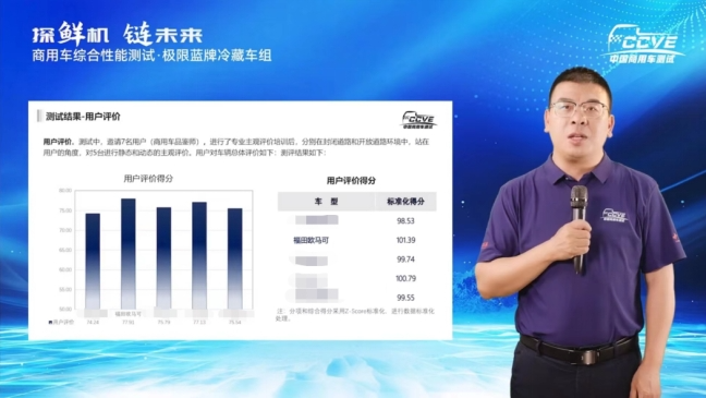 在用戶評價測試中,7名進行了專業主觀評價培訓,參與封閉道路和開放道路測試的品鑒師,站在用戶的角度,對參與評測的5臺極限藍牌冷藏車進行靜態和動態的主觀評價。最終,全新一代歐馬可S1冷藏車產品101.39的優異成績,斬獲第一,成為最受品鑒師喜愛和信賴的極限藍牌冷藏車。