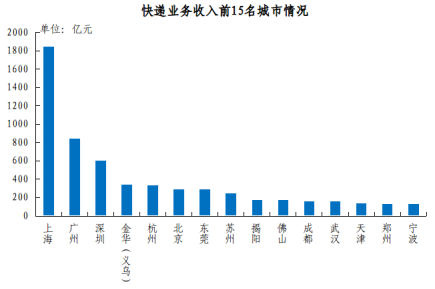 快遞業務收入排名前十五位的城市依次是上海、廣州、深圳、金華(義烏)、杭州、北京、東莞、蘇州、揭陽、佛山、成都、武漢、天津、鄭州和寧波,其快遞業務收入合計占全部快遞業務收入的比重達到55.5%。