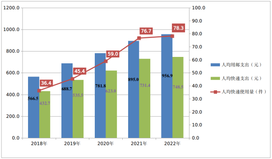 2018-2022年人均用郵支出、快遞支出和快遞使用量情況