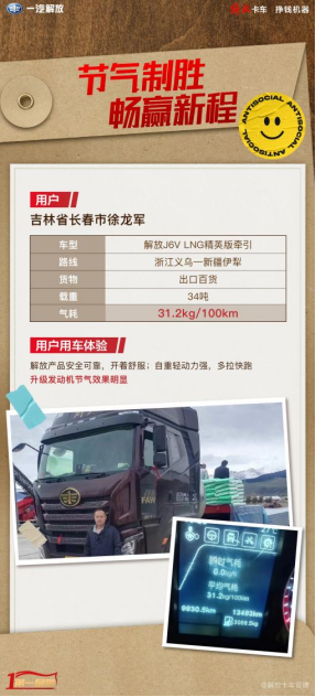 來自吉林省長春市的徐龍軍師傅表示,他駕駛的是一輛解放J6V 530馬力LNG精英版牽引車。平常他運送出口百貨,往返于浙江義烏和新疆伊利線路。徐師傅的車輛載重在34噸上下,氣耗為31.2kg/100km,能夠如此“省”,徐師傅認為這歸功于解放J6V的自重輕帶來成本優勢。車輛自重方面的大幅優化,令J6V更貼合用戶“多拉快跑”的需求,成為市場后起之秀。