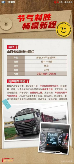 來自山西臨汾市的女卡友杜麗紅女士介紹,她的解放J6V平地板牽引車主要是進行跨省煤炭運輸,車輛經常往返于陜西榆林和湖南地區,通常載重達33噸,百公里氣耗為33.1kg。