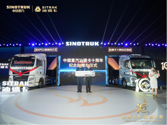 2023年4月26日,付忠艷的傳奇汕德卡達(dá)成300萬運(yùn)營里程,恰逢中國重汽汕德卡上市十周年,他將這輛“傳奇”汕德卡作為一份特別的“慶生賀禮”贈(zèng)送給中國重汽,而中國重汽則將全球第一輛汕德卡十周年紀(jì)念款C9H贈(zèng)予付忠艷,以進(jìn)階品質(zhì)共赴更加令人歡欣鼓舞的新十年,象征著汕德卡與功勛客戶“永以為好”,被行業(yè)引為佳話。