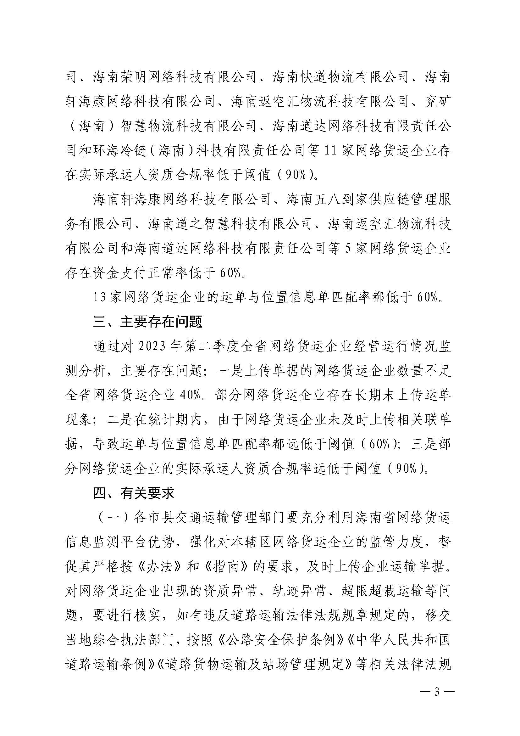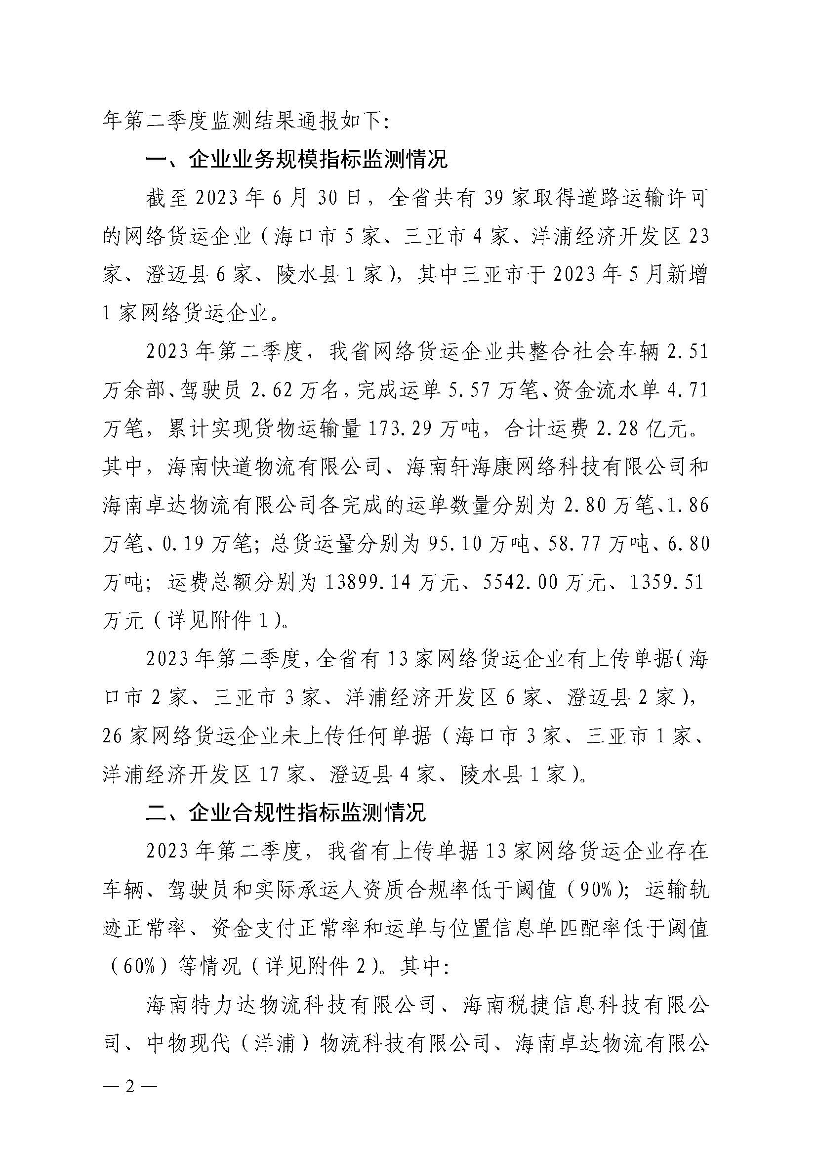 【海南】道路運輸局關于2023年第二季度全省網絡貨運企業經營運行監測情況的通報