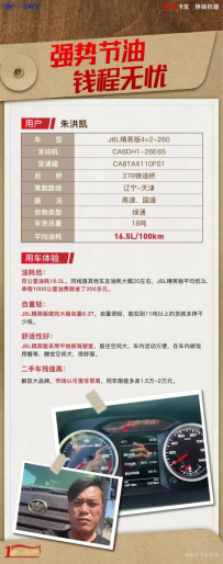 卡車司機朱洪凱師傅,經常往返于遼寧-天津路段,他說跑長途拉綠通,省油、多掙錢是關鍵,這也是他選擇解放J6L精英版最重要的原因之一。他說:“我這車百公里油耗只有16.5L,相對同線路其他車友平均低3L,單程1000公里油費就省了200多塊錢。還有,J6L精英版做完大箱自重6.3噸,車輛自重輕,能拉到11噸以上的貨就多掙不少錢。另外,解放是大品牌,解放車市場認可度也特別高,同年限的二手車相比其他品牌能多賣1.5萬-2萬元,真的是又會賺又能省,特別合適。”