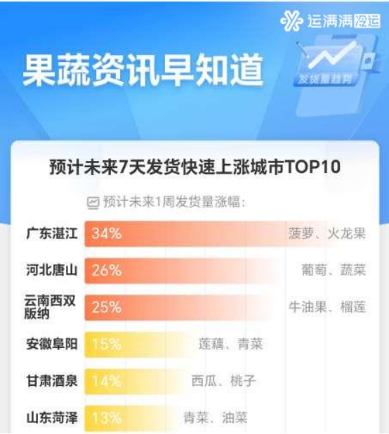 運滿滿冷運數據顯示,“早知道”上線以來,山東、新疆、河北、東三省、云南、廣西等地區的多個產地平均接單時間環比2022年有了明顯提速。例如蔬菜產地與集散地山東濰坊9月1日-22日的運單平均接單時間同比2022年縮短了11%,知名水果產地新疆烏魯木齊、云南昭通分別縮短了13%、11%。