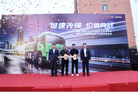 在現場嘉賓的見證下,一汽解放青島中重型車產品線整車開發首席工程師、自卸PDT經理孫中甲、一汽解放青島中重型車銷售公司浙滬地區部經理黃文浩向用戶交付象征合作的金鑰匙,雙方將攜手在上海區域披荊斬棘、共贏新程。