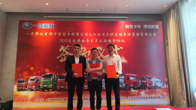 活動最后,江西浩大供應(yīng)鏈管理集團有限公司董事長陳建勇、一汽解放本部中重型車銷售公司高級主任管理師楊天明、萍鄉(xiāng)三鑫達(dá)汽車貿(mào)易有限公司董事長徐定河交換簽約本并實地走訪江西浩大供應(yīng)鏈管理集團有限公司的用車現(xiàn)場。