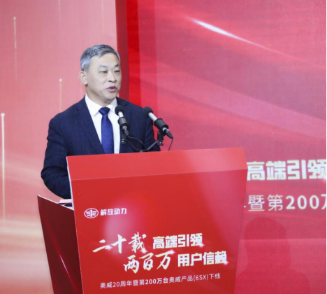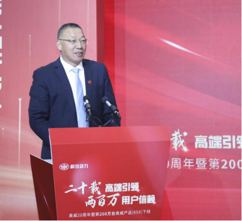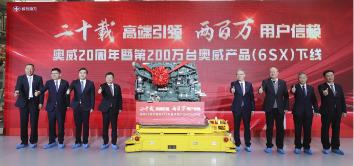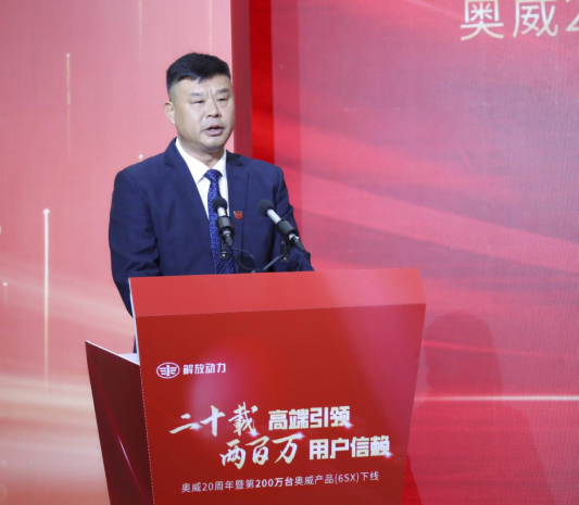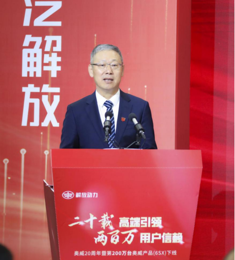 吳碧磊發表講話。他表示,解放動力奧威產品的問世,為一汽自主事業躍遷發展按下了“加速鍵”。第200萬臺奧威發動機(6SX)的隆重下線,是解放動力在多元燃料、智能控制等先進技術加持下的又一扛鼎之作,充分彰顯了解放動力踐行新發展理念的責任擔當,打造“民族品牌、高端動力”的執著追求。面對新形勢、新任務、新挑戰,解放動力作為助推解放事業發展的重要力量,要主動向新能源領域進軍,全力打響解放智慧動力域品牌,為解放動力總成產業高質量可持續發展奠定堅實的基礎。