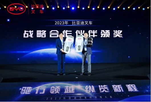 2023年比亞迪叉車蓬勃發展的道路上,我們得益于自身的不懈努力,也離不開一路攜手并肩的伙伴們的支持,在前行路上我們凝心聚力,密切協作,為新能源叉車行業的發展提供了強有力的支撐,此次大會比亞迪叉車特授予廣州佛朗斯股份有限公司戰略合作伙伴獎。