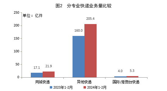 1-2月,同城快遞業務量完成21.9億件,同比增長28.3%;異地快遞業務量完成205.4億件,同比增長28.5%;國際/港澳臺快遞業務量完成5.3億件,同比增長31.9%。