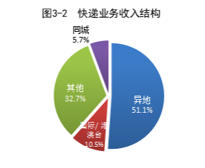 1-2月,同城、異地、國際/港澳臺快遞業務量分別占全部快遞業務量的9.4%、88.3%和2.3%;業務收入分別占全部快遞收入的5.7%、51.1%和10.5%。與去年同期相比,同城快遞業務量的比重基本保持一致,異地快遞業務量的比重下降0.1個百分點,國際/港澳臺業務量的比重上升0.1個百分點。