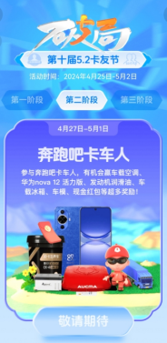 4月27日-5月1日,“第十屆5.2卡友節(jié)”前夕,登錄“卡友地帶”APP,參與首頁《奔跑吧卡車人》互動小游戲,就有機(jī)會贏取車載空調(diào)、華為nova 12活力版、發(fā)動機(jī)潤滑油、車載冰箱、車模、現(xiàn)金紅包等超多獎勵!