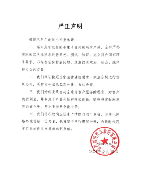 5月10日,眼見事件逐漸發酵,福田汽車也不再選擇繼續容忍,為避免不明真相的用戶,被虛假信息所蒙騙,維護自身的合法權益,正式在北京召開媒體說明會,并發布了一則“嚴正聲明”,做出四項承諾:一是,福田汽車的所有產品都是嚴格按照國家法規標準進行開發、測試、驗證的,完全符合國家環保要求,不存在任何排放問題,愿意接受政府、社會、媒體和公眾的監督;二是,福田保證按照國家法律法規要求,依法合規進行信息公開,所有公開信息客觀公正,合法合規;三是,福田汽車始終秉持全心全意為客戶服務的理念,對客戶負責到底,并且專注于產品的創新,堅決與虛假惡意言論做斗爭,與不正當競爭做斗爭;第四點,則是說到了福田將響應國家“清朗行動”號召,為凈化網絡環境貢獻力量。
